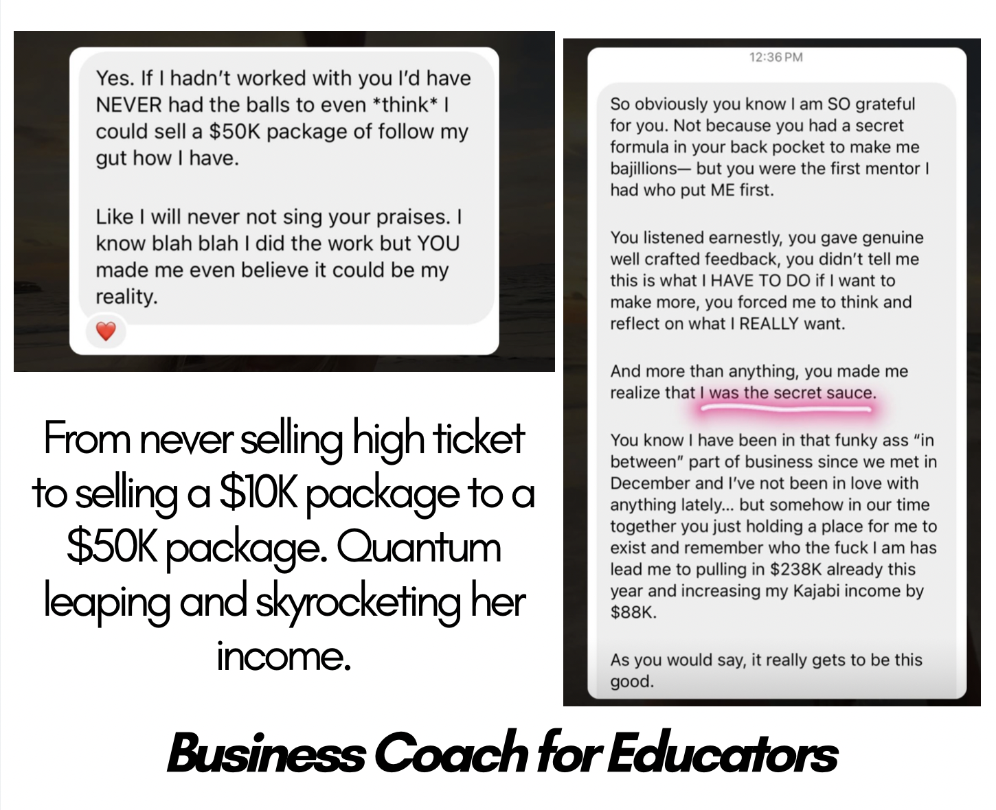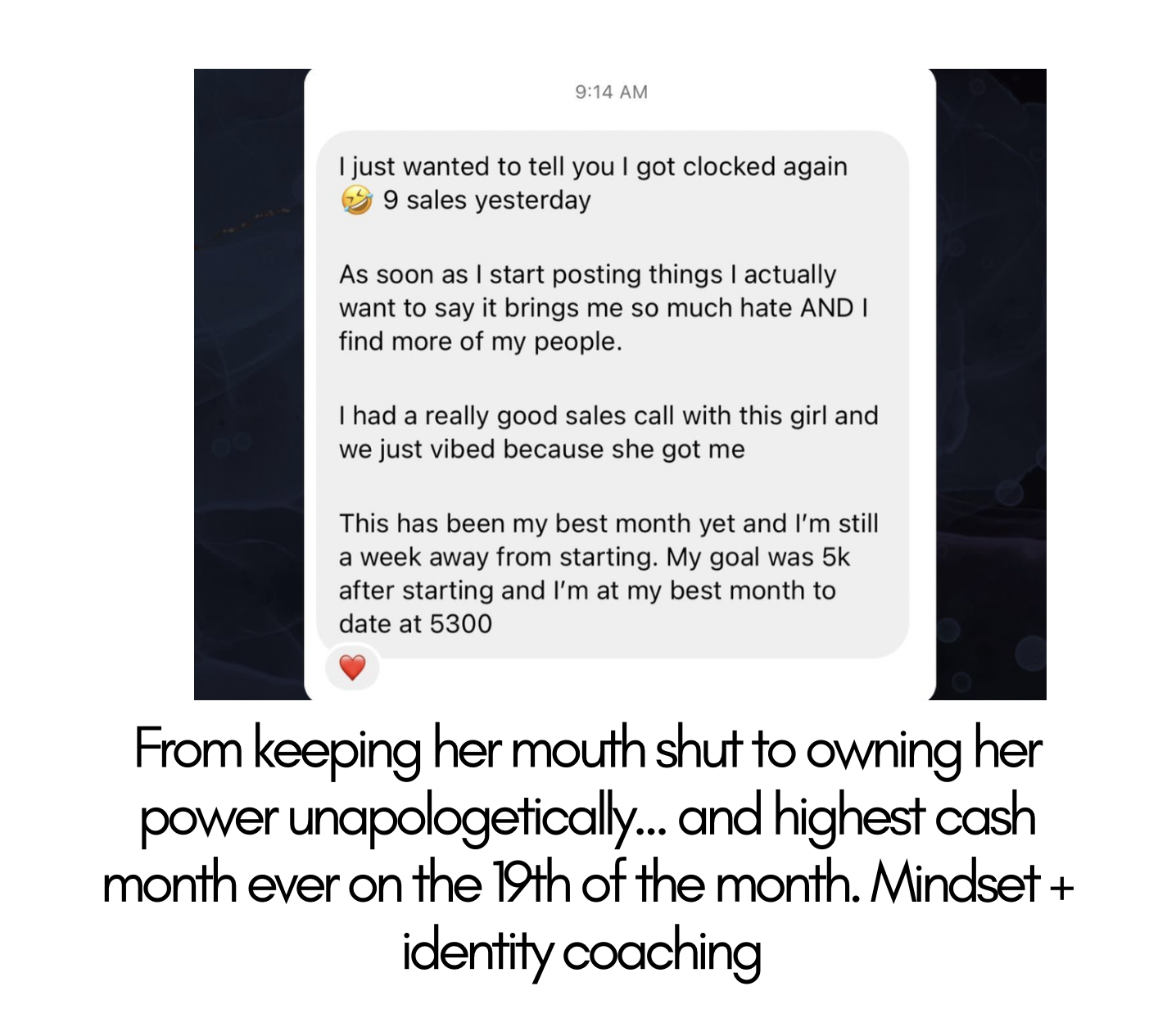 I have dozens upon dozens of testimonials with women skyrocketing their income - but it’s because they lean in, they’re disconnected from instant gratification, and they do the work. They’re go getters, 1%ers, and ready-to-do-what-it-takers. The people who join are not just looking for a quick financial ROI, they’re looking for leadership skills, mindset breakthroughs, identity uplevels, frequency alignment, and becoming the best version of themselves…. Because they know $ is a byproduct of THAT.